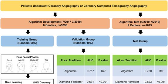 对于一些疾病,医生看脸就能知道一两件事,这在中医中比较常见。如今,借助先进的计算机技术,西医也可以“看脸识病”。 8月20日,阜外医院郑哲教授和全国其他8家医院郑哲教授和清华大学纪向阳教授团队在欧洲心脏杂志上发表的多中心横断面研究表明,通过计算机深度学习算法,您可以通过查看面部照片来评估一个人患冠心病的风险。研究人员指出,该技术可能有助于门诊冠心病风险评估和社区高危人群冠心病早期筛查。未来,有必要进一步开发临床可用的工具。该研究首先招募了2017年7月至2019年3月来自全国8家医院的5796名接受择期冠状动脉造影或冠状动脉CT血管造影的患者,其中90%(5216人)被随机分配到研究中。在训练组中,剩下的 10%(580 人)被分成验证组来构建深度学习算法。然后,从2019年4月至2019年7月,该研究纳入了来自9家医院的1013名接受择期冠状动脉造影或冠状动脉CT血管造影的患者作为测试组,以验证深度学习算法。结果表明,以影像诊断为参考标准时,验证组基于人脸照片的冠心病检测算法的灵敏度为0.8,特异性为0.61,ROC曲线下面积(AUC)为0.757,准确率明显更高。基于传统的 Diamond-Forrester 模型(AUC 为 0.631)和广泛使用的冠心病联盟临床评分(AUC 为 0.694)。在测试组中,基于面部照片的冠心病检测算法的灵敏度高达0.8,特异性为0.54,AUC为0.73。其准确率也明显高于 Diamond-Forrester 模型(AUC 为 0.623)和冠心病联盟临床评分(AUC 为 0.652)。