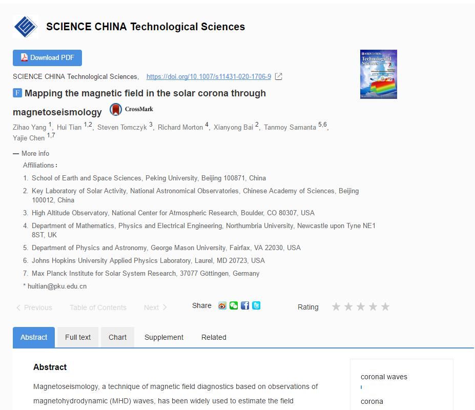 通过磁震学绘制日冕磁场图发表在《中国科学技术科学》上